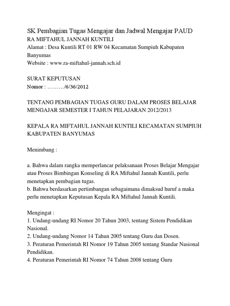 Contoh sk pengangkatan guru paud tk tahun 2017 2018 rpph. Kherysuryawan id contoh sk pembagian tugas mengajar guru dan staff tata usaha di sekolah sd smp. Surat keputusan atau sk pembagian tugas mengajar merupakan salah satu bagian administrasi guru yang cukup penting, karena digunakan sebagai bentuk fisik jika ada monev. 24 tahun 2006 tentang pelaksanaan permendiknas nomor 22 tahun 2006 dan nomor 23 tahun 2006. 34 tahun 2018 tentang standar nasional pendidikan smk.